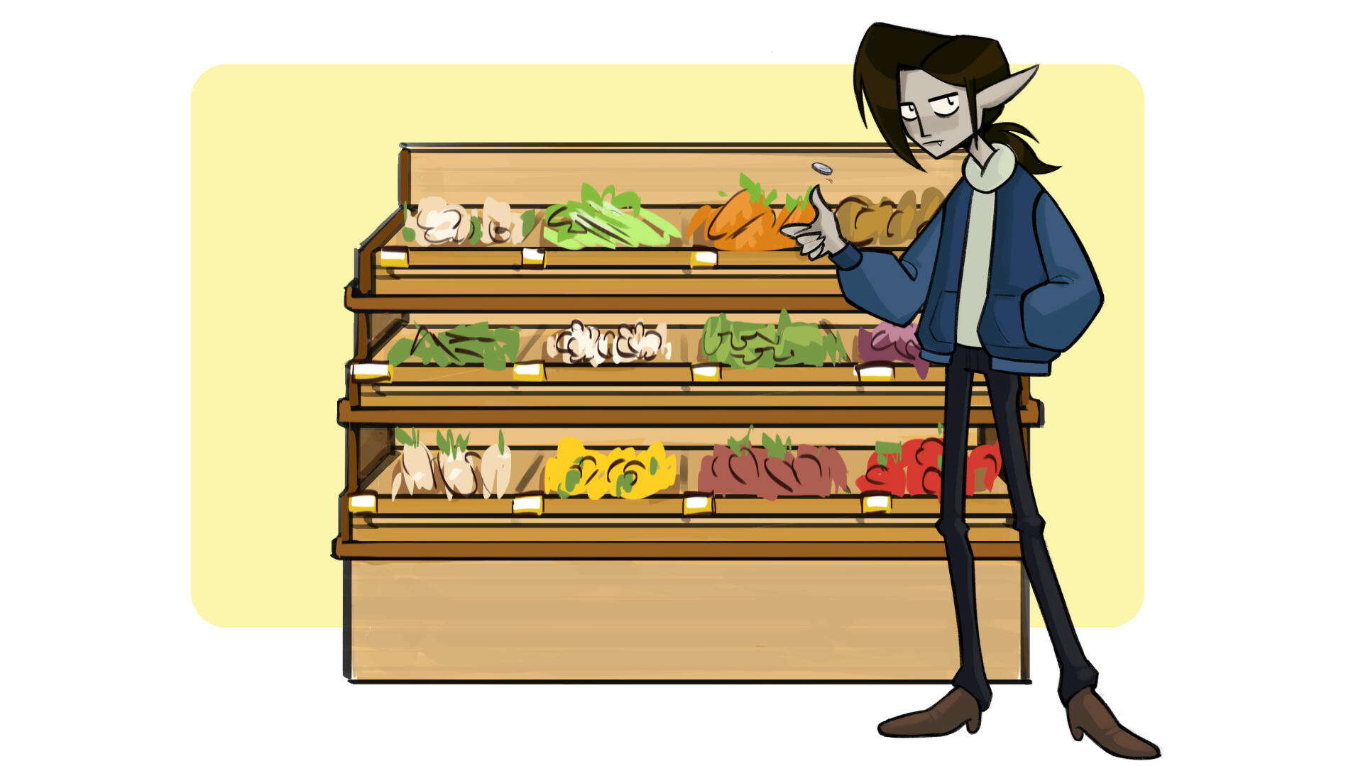 A vampire takes a trip to the grocery store -- dropping all of his coins once he encounters garlic in the vegetable aisle.